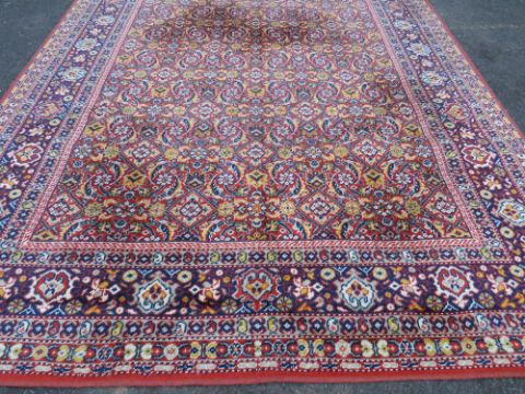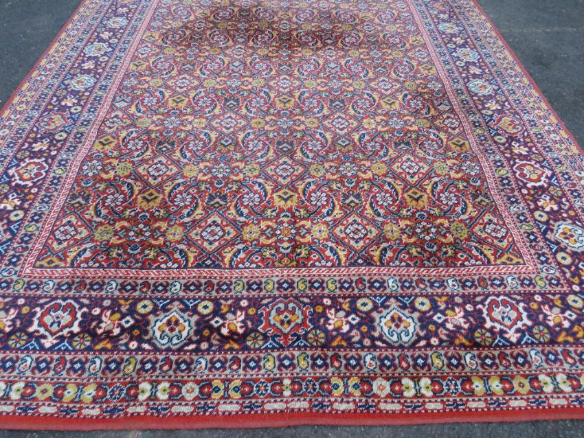 A LARGE CARPET - RUST / TERRACOTTA GROUND WITH NAVY / YELLOW PATTERN, APPROX 365 X 253 CM - WEAR THROUGHOUT