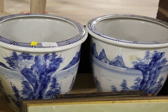 A TRAY OF ASSORTED PICTURES AND PRINTS TO INCLUDE AN ORIENTAL CRANE EXAMPLE, TWO BLUE AND WHITE THAI PLANTERS - ONE HEAVILY CRACKED PLUS AN ORIENTAL FIGURE OF A SEATED LAUGHING BUDDHA HOLDING A PEACH A/F