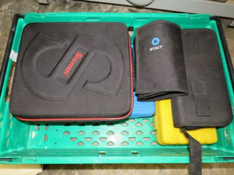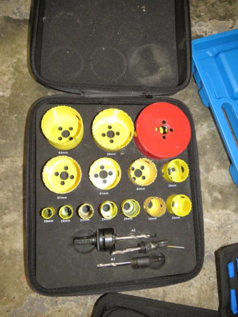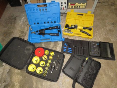A BOXED BLIND NUT RIVETER, HYDRAULIC CABLE CRIMPER, AN IFIXIT MULTI TOOL DRIVER SET, A PART SET OF CABLE CRIMPER DIES, A STARRETT TANK HOLE CUTTER SET