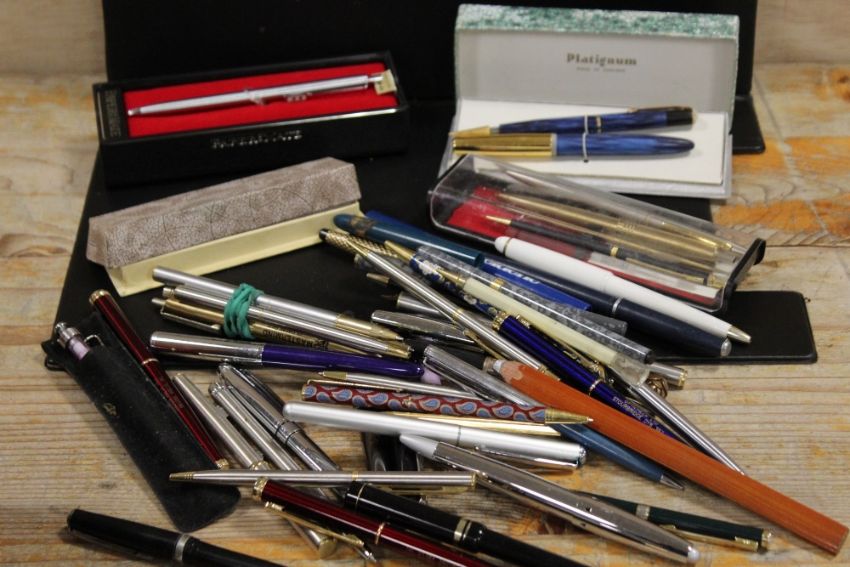 A TRAY OF ASSORTED PENS AND WRITING IMPLEMENTS TO INCLUDE BOXED PAPERMATE EXAMPLES