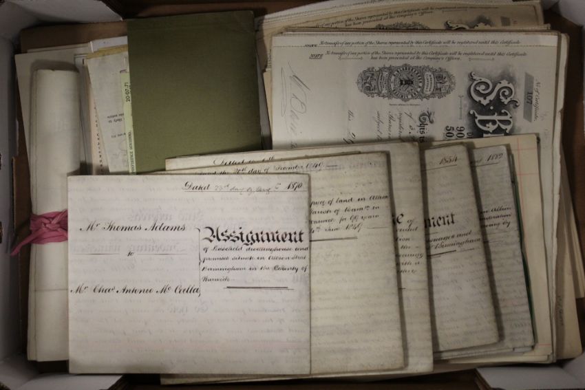 A TRAY OF ANTIQUE DOCUMENTS AND EPHEMERA TO INCLUDE VICTORIAN EXAMPLES AND SHARE CERTIFICATES