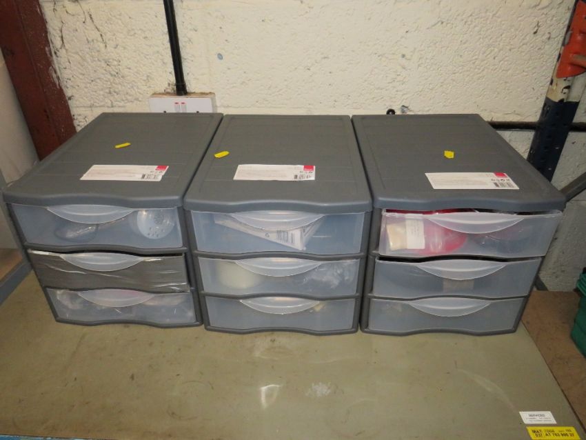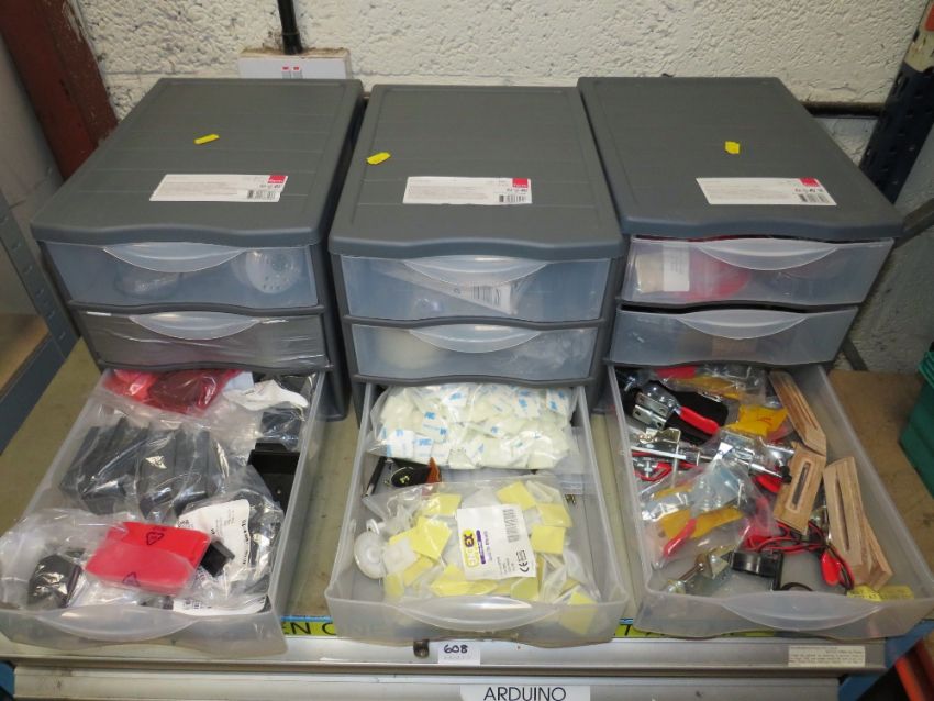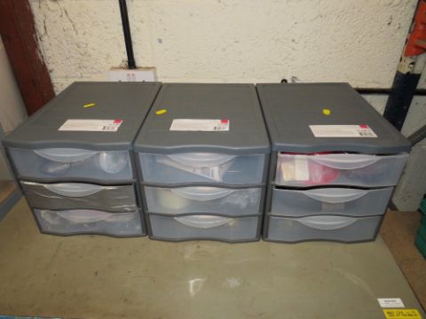 THREE PLASTIC DRAWERS CONTAINIGN JIG CLAMPS, CABLE TIE MOUNTS, POTTING BOXES, WIRE WOUND RESISTORS, LOAD SENSORTS, SHRINK SLEEVING, TAPES