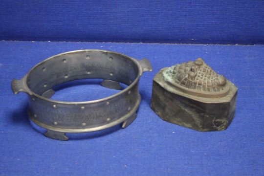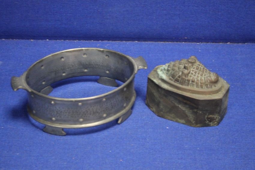 AN ANTIQUE COPPER JELLY MOULD AND A PEWTER DISH RING