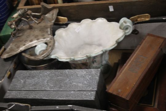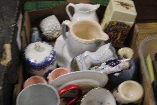 FOUR TRAYS TO INCLUDE CHINA, VINTAGE TEDDY, WEDGEWOOD, PICTURES, BESWICK TOBY JUG ETC (TRAYS NOT INCLUDED)
