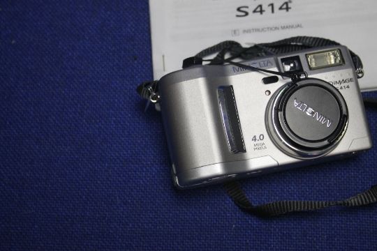 A MINOLTA DIGITAL CAMERA WITH INSTRUCTION MANUAL ALONG WITH A SMALL CANON CAMERA