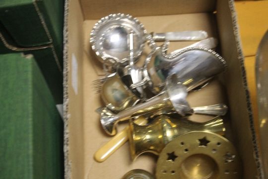 A SMALL BOX OF PRINKNASH POTTERY AND A SMALL QUANTITY OF SILVER PLATE ETC