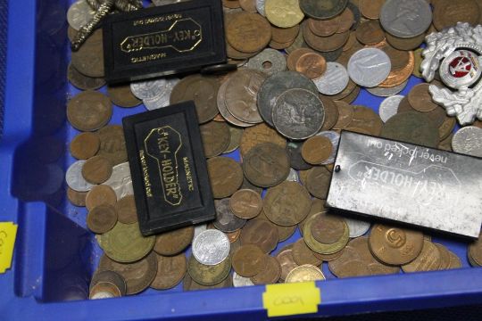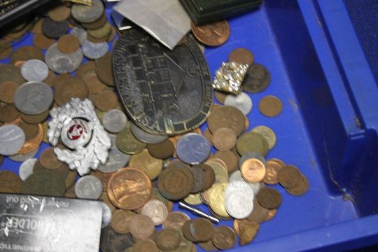 A COLLECTION OF ASSORTED COINS AND BADGES ETC