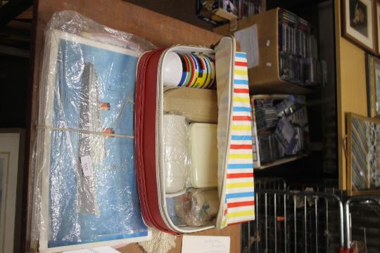 A CASED PICNIC SET AND RMS QUEEN ELIZABETH PUZZLE, CUNARD LETTERS AND TABLE MATS