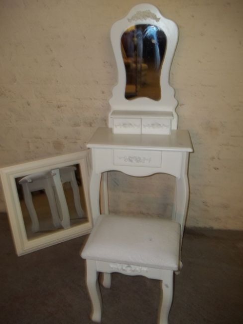 AN IKEA FRENCH STYLE DECORATIVE SMALL DRESSING TABLE AND MIRROR WITH STOOL