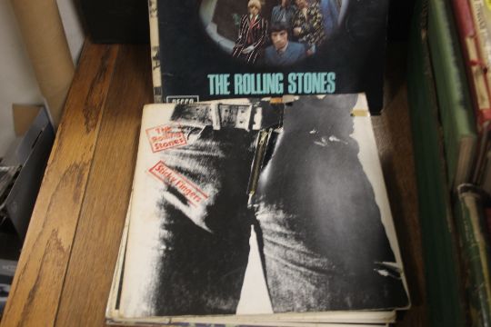 BOX CONTAINING LPS TO INCLUDE THE ROLLIG STONES MONO LK4605, ROLLING STONES NUMBER 2 MONO LK4661, STICKY FINGERS, AFTERMATH, BETWEEN THE BUTTONS, LET IT BLEED, EXILE ON MAIN STREET, BEGGARS BANQUET, HIGH TIDE AND GREEN GRASS ETC
