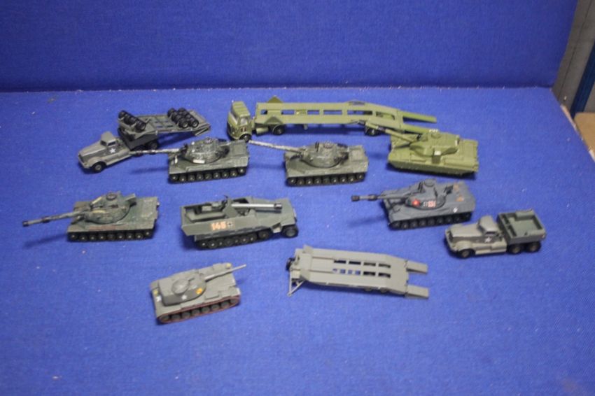 A COLLECTION OF FIVE DINKY TANKS TO INCLUDE FOUR X LEOPARDS AND CHIEFTAN, DINKY AEC ARTICULATED TANK TRANSPORTER, DINKY TANK DESTROYER, TOGETHER WITH TWO X CORGI DIAMOND T TANK TRANSPORTERS AND ONE CORGI M60A1 MEDIUM TANK