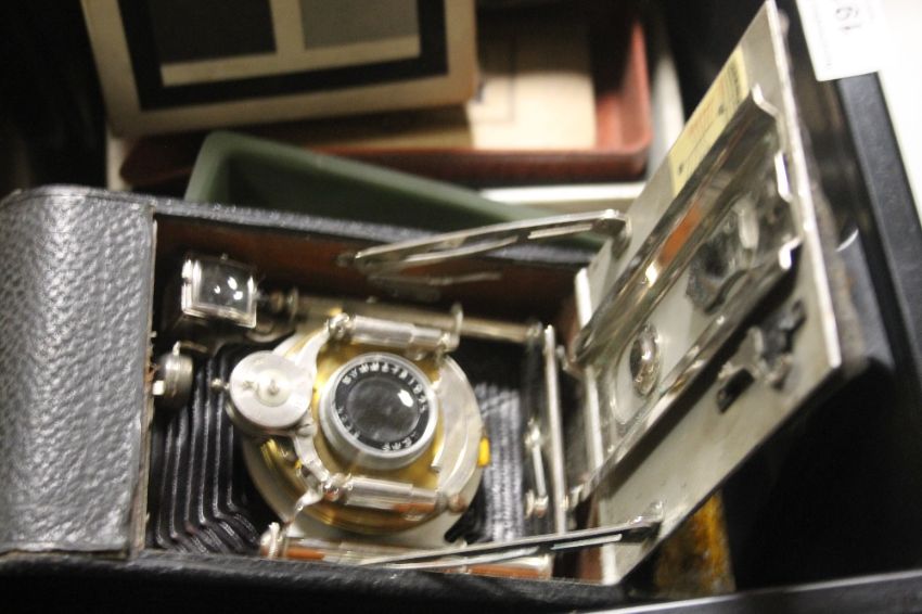 A VINTAGE CABINET CAMERA ALONG WITH PHOTOGRAPHIC EQUIPMENT