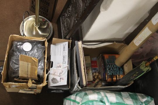 A BOX OF PICTURES, BOOKS , VINTAGE UMBRELLA AND A ALDIS PROJECTOR