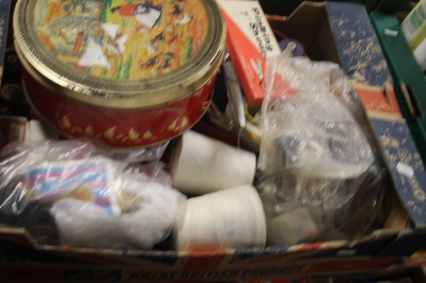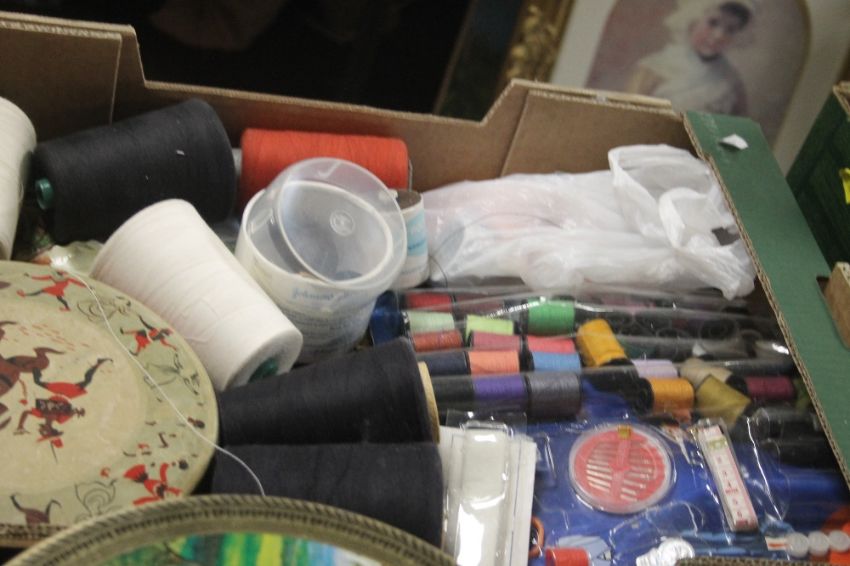 FOUR TRAYS TO INCLUDE CHINA ORNAMENTS, TEA SET , VASES AND SEWING ACCESSORIES (TRAYS NOT INCLUDED)