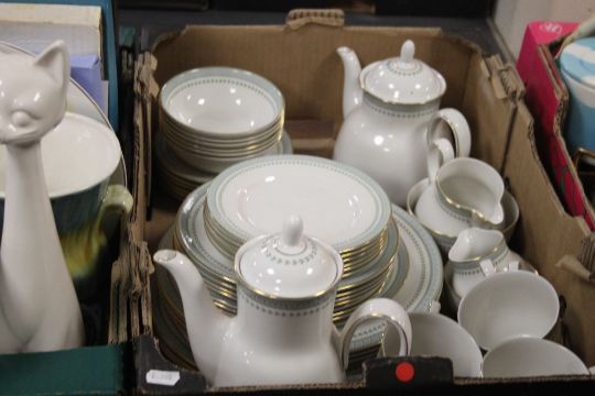 FOUR TRAYS CONTAINING PART ROYAL DOULTON DINNER SET, VASES INCLUDING SYLVAC , WALL PLATES, ORNAMENTS, BUNNYKINS ITEMS , ETC (TRAYS NOT INCLUDED)
