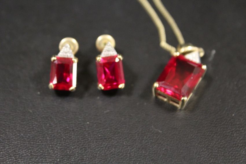 A EMERALD CUT RED STONE HALLMARKED 9CT GOLD PENDANT ON CHAIN STAMPED 375 WITH A MATCHING PAIR OF HALLMARKED 9CT GOLD EARRINGS (BUTTERFLIES NOT GOLD) APPROX WEIGHT OF CHAIN 2.1 G