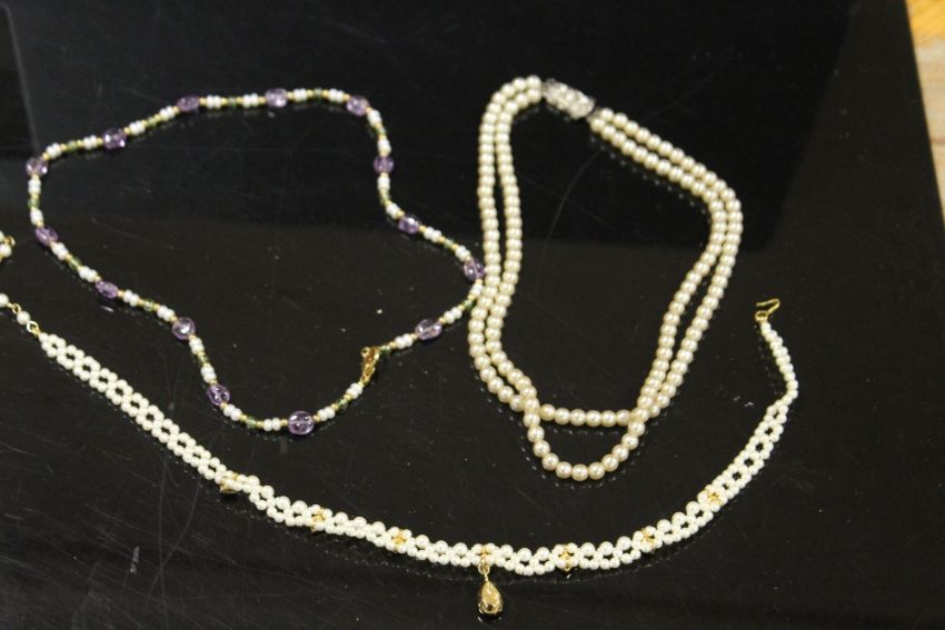 THREE VINTAGE & MODERN PEARL NECKLACES, TO INCLUDE A SEED PEARL EXAMPLE WITH INTERSPERSED POLISHED GEMSTONES
