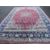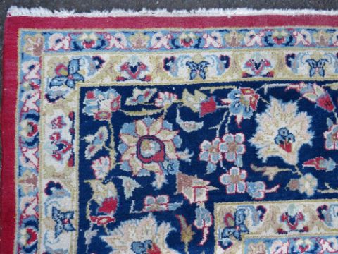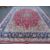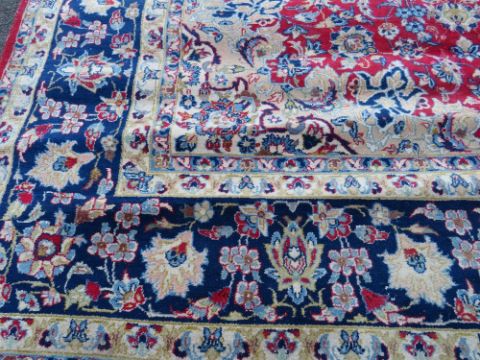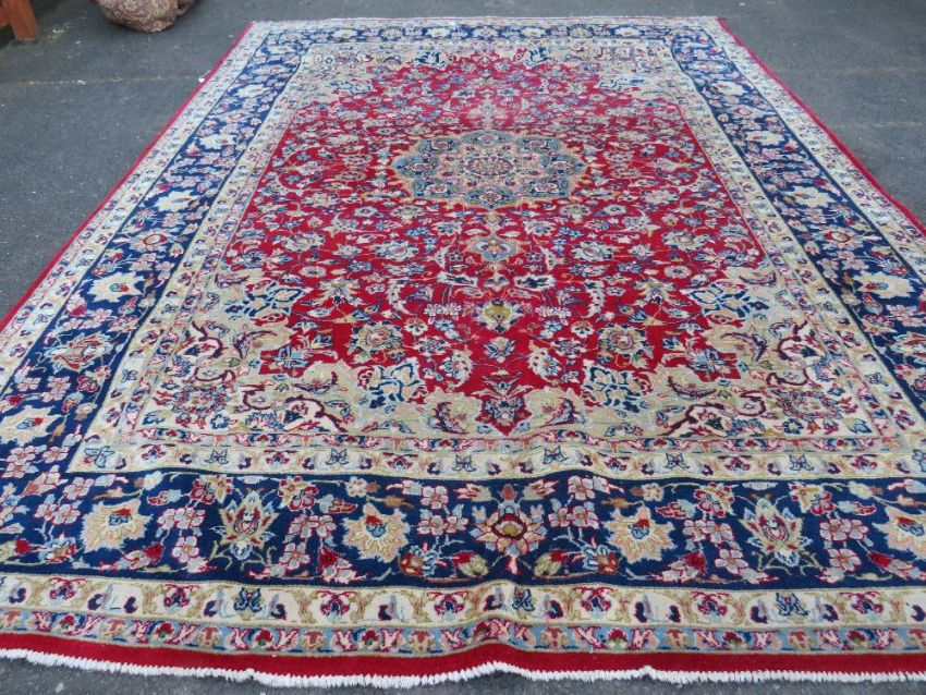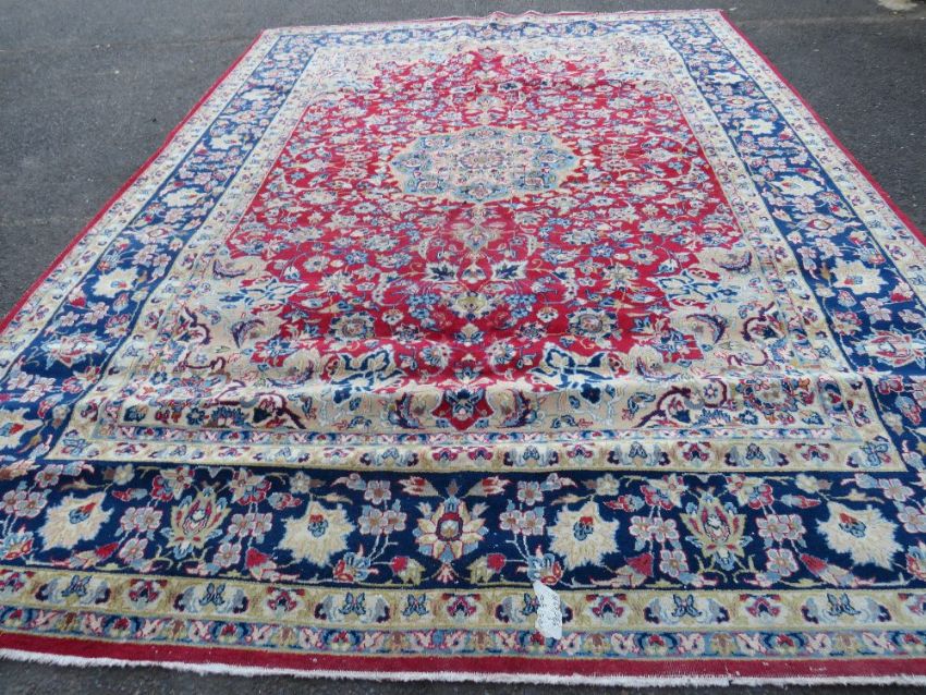 A LARGE RUG, CREAM GROUND WITH RED AND BLUE, APPROX 368 X 270 - WEAR THROUGHOUT