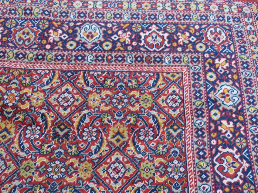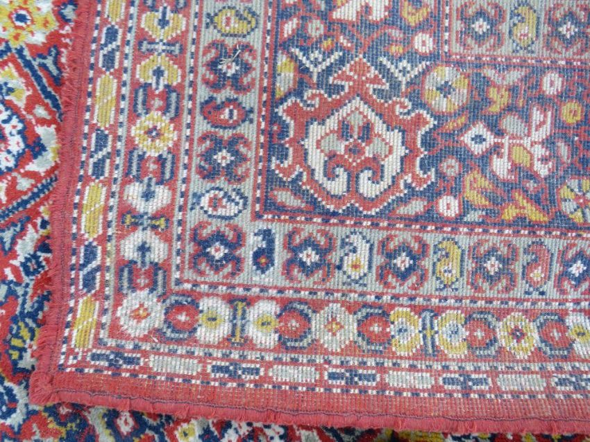A LARGE CARPET - RUST / TERRACOTTA GROUND WITH NAVY / YELLOW PATTERN, APPROX 365 X 253 CM - WEAR THROUGHOUT