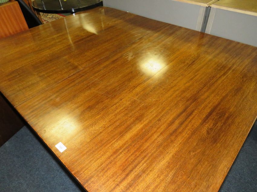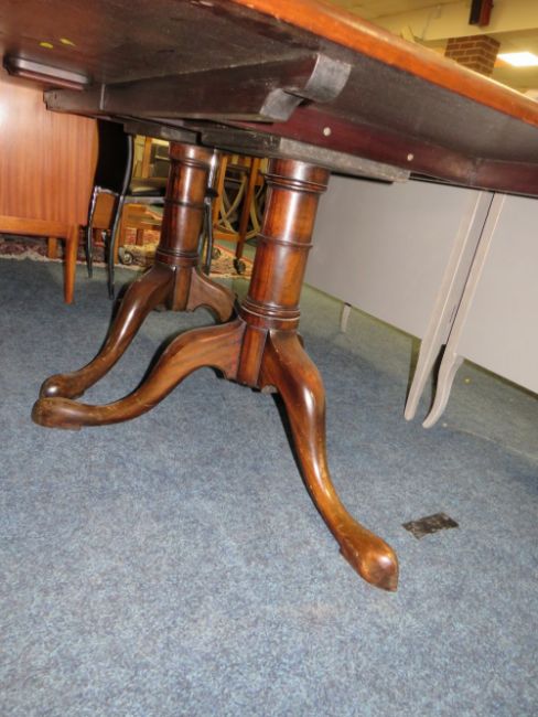 A LARGE HEAVY MAHOGANY DINING TABLE WITH ONE EXTRA LEAF AND BRASS CLIPS H-72 L-152 CM EXTENDED L-213 CM