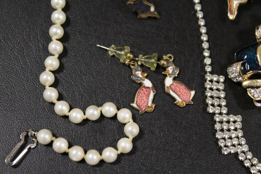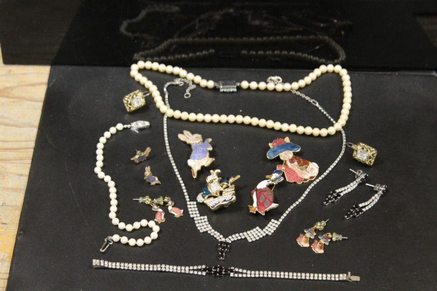 A COLLECTION OF ASSORTED VINTAGE COSTUME JEWELLERY TO INCLUDE A SELECTION OF BEATRIX POTTER ENAMEL BROOCHES AND EARRINGS
