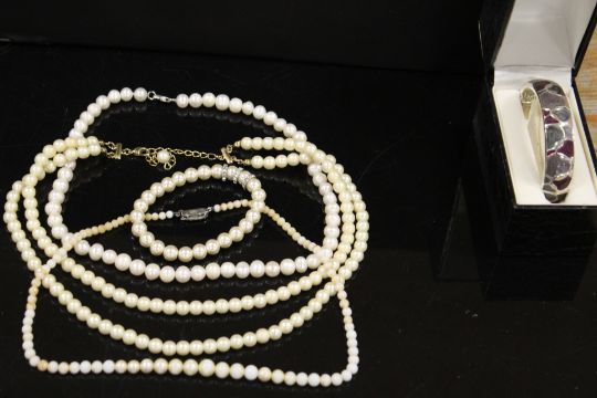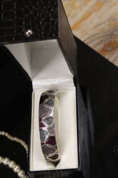 A SMALL TRAY OF COSTUME JEWELLERY TO INCLUDE AN INDIAN STYLE JEWELLERY BOX, BANGLE ETC
