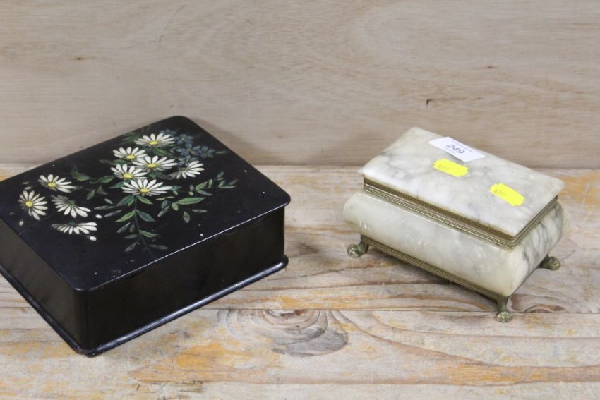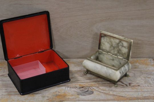 A GILT METAL MOUNTED JEWELLERY CASKET TOGETHER WITH A LACQUER WARE JEWELLERY BOX ((2)