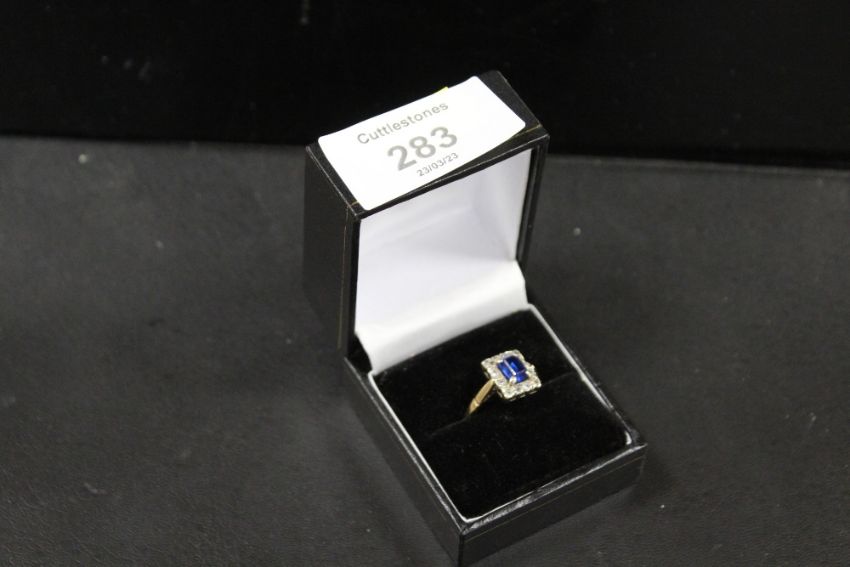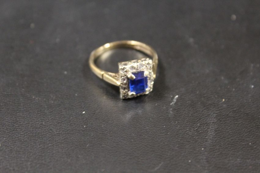 A HALLMARKED 9CT GOLD RING SET WITH A CENTRAL BLUE STONE - APPROX WEIGHT 3.2 G