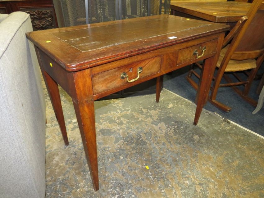 A 19TH CENTURY MAHOGANY TWO DRAWER SIDE TABLE WITH LEATHER TOP W-98 CM