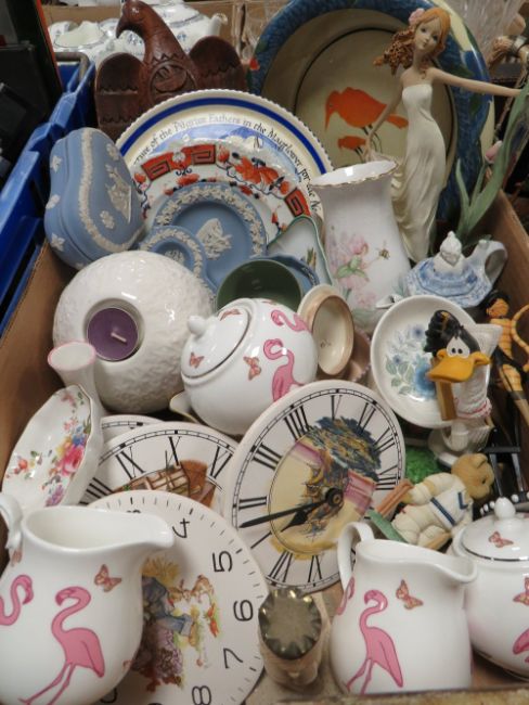 TWO TRAYS OF ASSORTED CERAMICS ETC TO INC WEDGWOOD JASPERWARE, MUSICAL STEINS, ART DECO EXAMPLES ETC