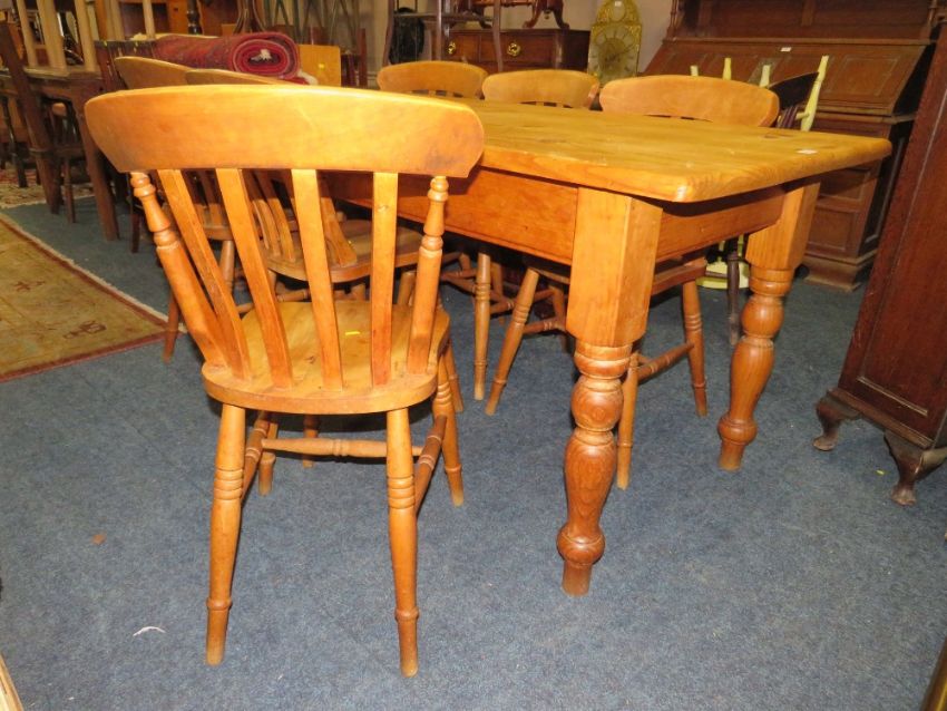 A LARGE HONEY PINE FARMHOUSE TABLE WITH SIX CHAIRS H-77 CM W-77 CM L-200 CM