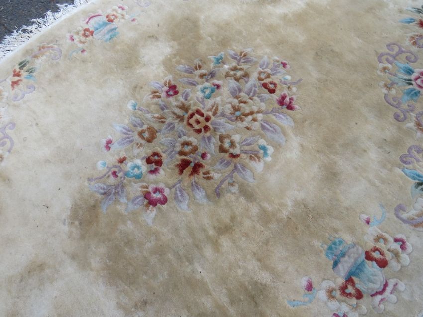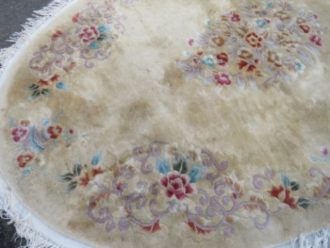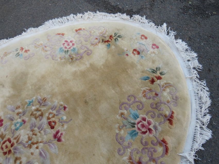 A LARGE 20TH CENTURY CHINESE OVAL WOOLLEN RUG 264 X 184 CM APPROX