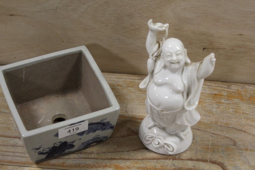 AN ORIENTAL BLUE AND WHITE WITH CHARACTER MARK TO BASE, TOGETHER WITH A BALANCE DE CHINE FIGURE OF A LAUGHING BUDDHA A/F (2)