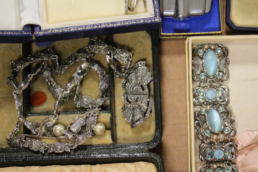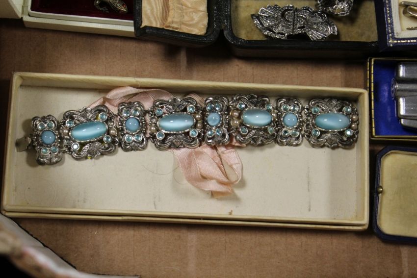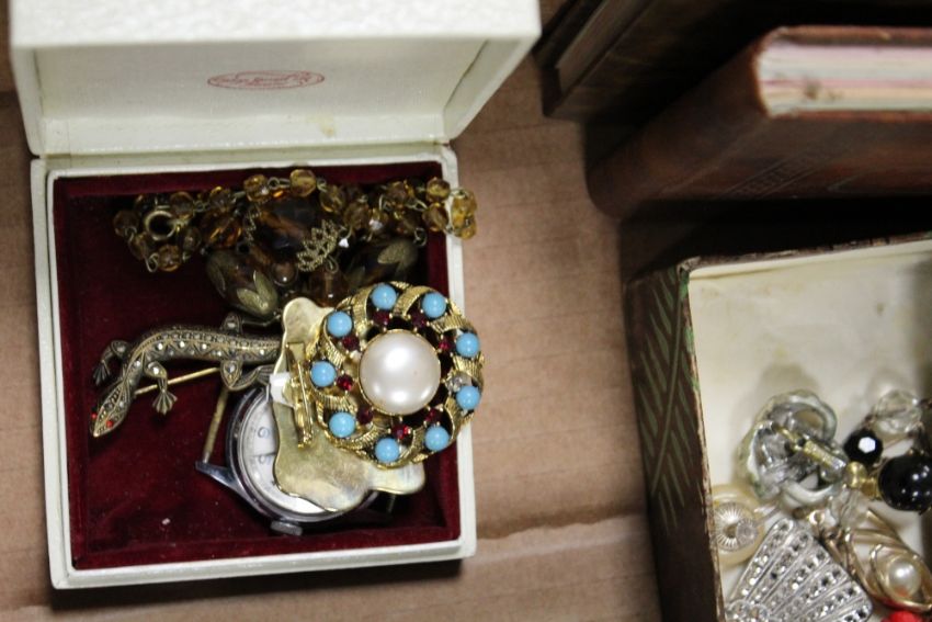 A TRAY OF ASSORTED VINTAGE COSTUME JEWELLERY ETC TO INCLUDE A COLLECTION OF MARCASITE SET JEWELLERY, MINIATURE WEDGWOOD PANELS ETC