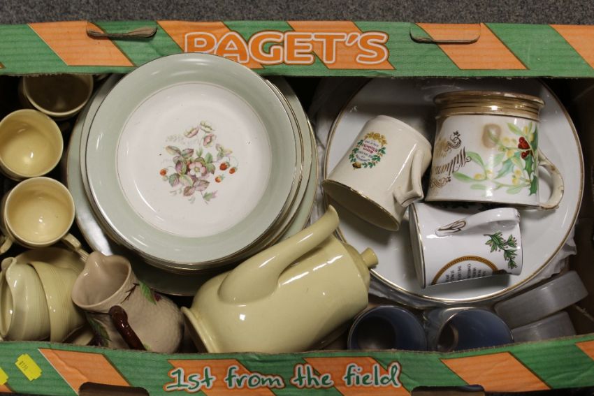 TWO TRAYS OF CERAMICS ETC TO INCLUDE A PAIR OF BRETBY BLUEBIRD VASES