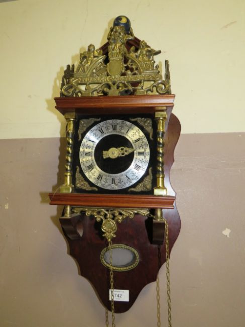 A REPRODUCTION DUTCH WALLCLOCK WITH BRASS WEIGHTS