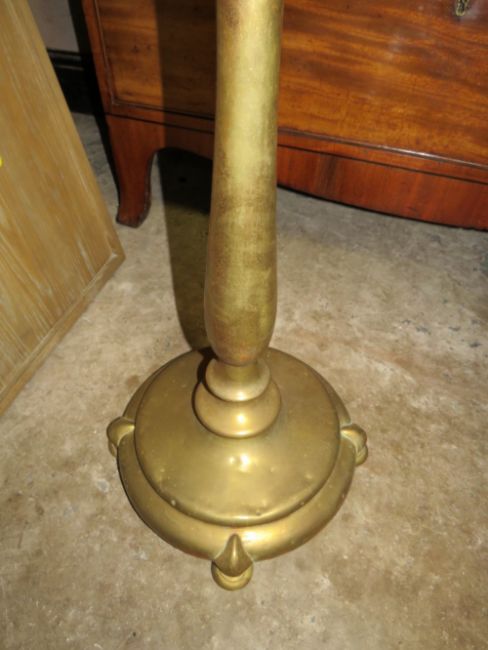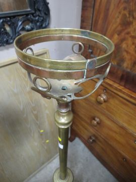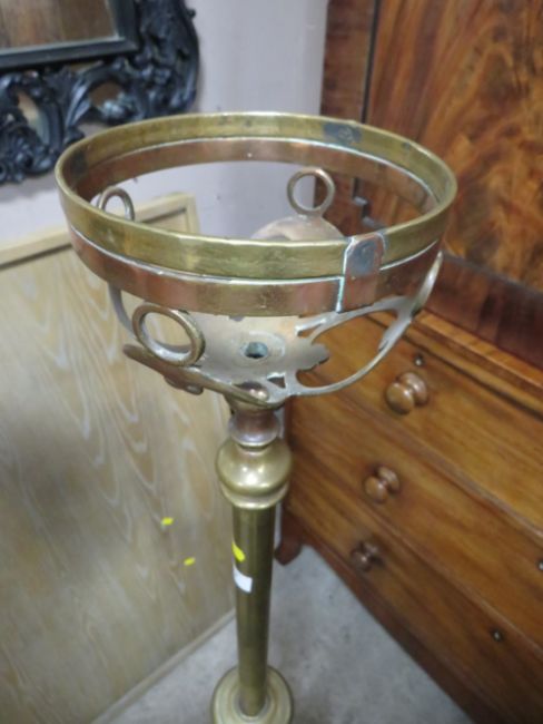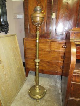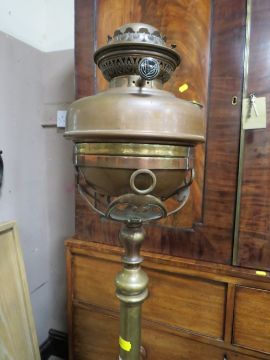 A VICTORIAN BRASS LAMP STANDARD WITH COPPER RESERVOIR, SHADE-FUNNEL