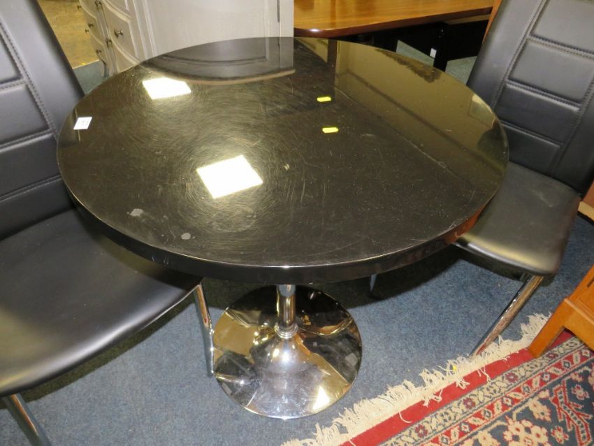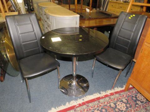 A MODERN BLACK BISTRO TABLE WITH TWO CHAIRS