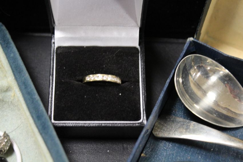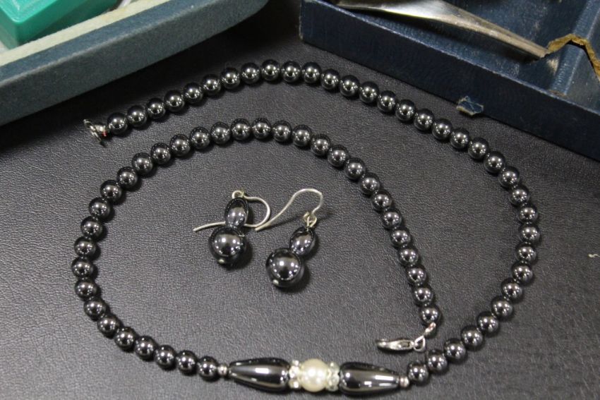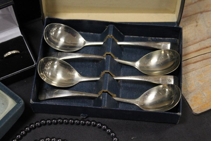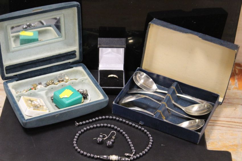 A COLLECTION OF ASSORTED COSTUME JEWELLERY ETC TO INCLUDE A HAEMETITE EARRING AND NECKLACE SET, SILVER MARCASITE EARRINGS, CUBIST GLASS EARRINGS TOGETHER WITH A BOXED SET OF FOUR SPOONS