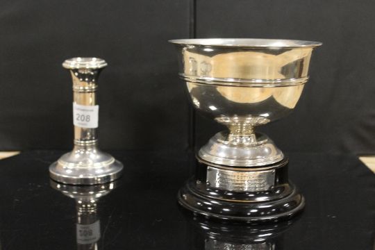 A HALLMARKED SILVER CANDLESTICK TOGETHER WITH A SMALL TROPHY BOWL ON STAND (2)
