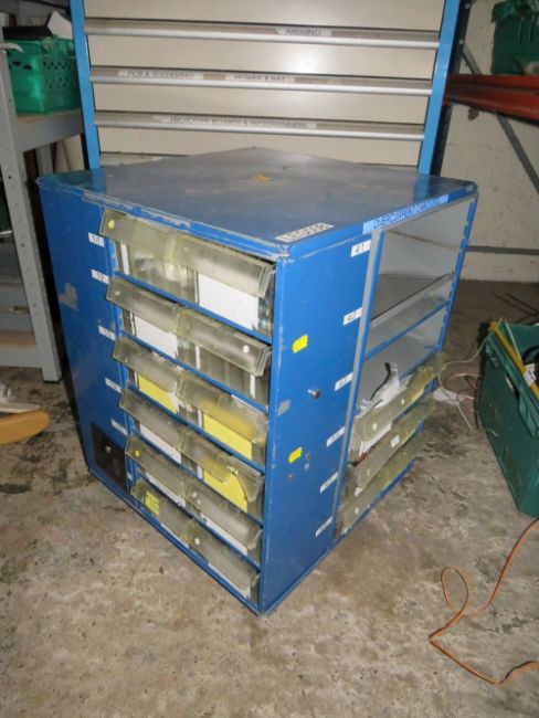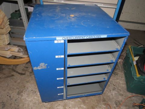 A ROTATING STORAGE CAROUSEL CONTAINING VARIOUS SYRINGES, ROTARY CUTTERS, BUTTONS ETC
