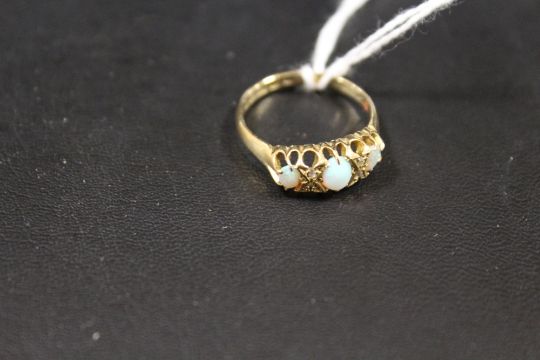 A HALLMARKED 18CT GOLD THREE STONE OPAL RING - APPROX WEIGHT 2.3 G