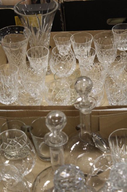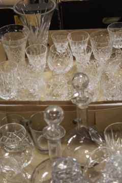 TWO TRAYS OF ASSORTED GLASSWARE TO INCLUDE DECANTERS, WINE GLASSES ETC