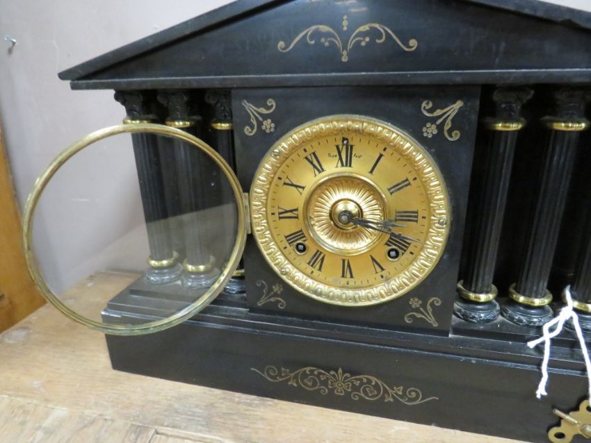 AN ANTIQUE BLACK SLATE MANTLE CLOCK