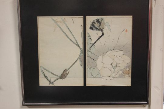 A MODERN 2 PANEL PICTURE OF FLOWERS FRAMED 44 CM X 39 CM