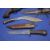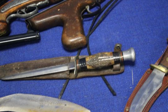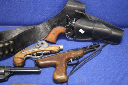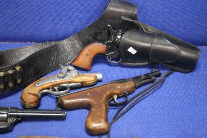 A BOX OF IMITATION/REPRODUCTION PISTOLS TOGETHER WITH A BOWIE KNIFE, A KUKRI KNIFE ETC