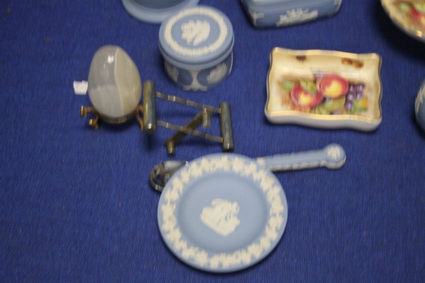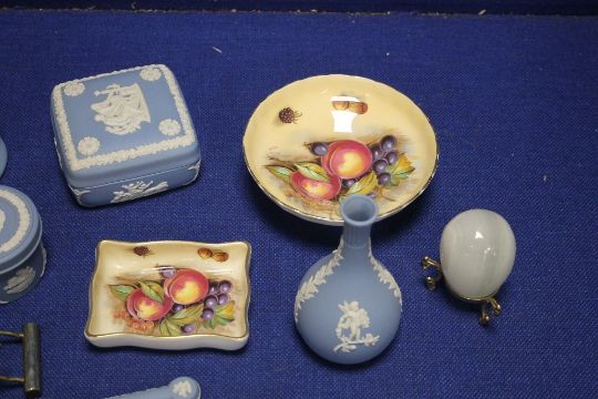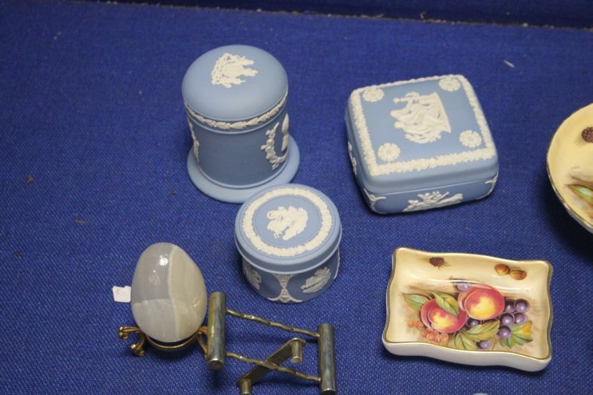 A COLLECTION OF WEDGWOOD JASPERWARE TOGETHER WITH AYNSLEY ORCHARD GOLD BOWL ETC
