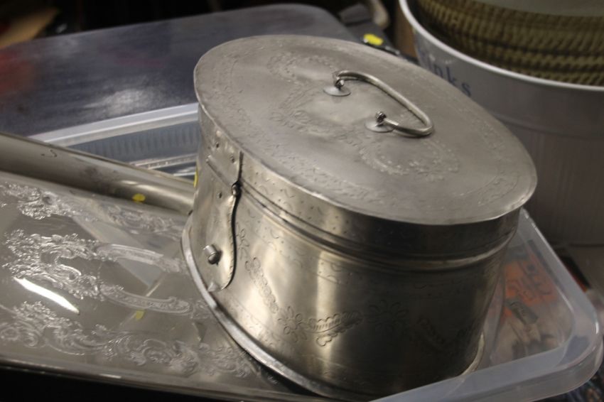 TWO TRAYS OF METALWARE TOGETHER WITH AN ICE BUCKET ETC (TRAYS NOT INCLUDED)