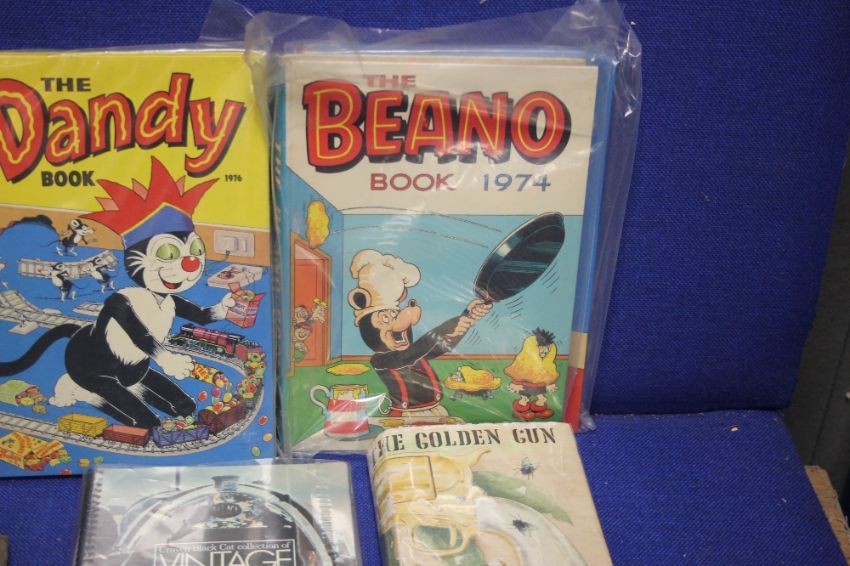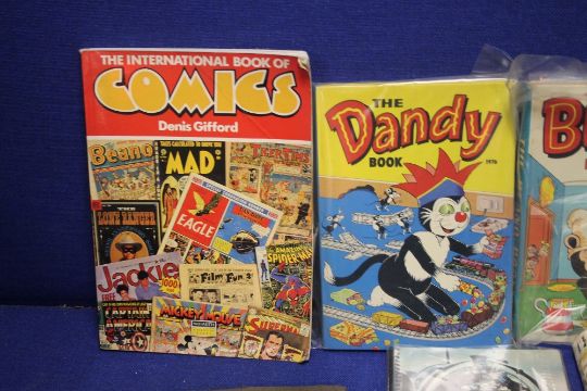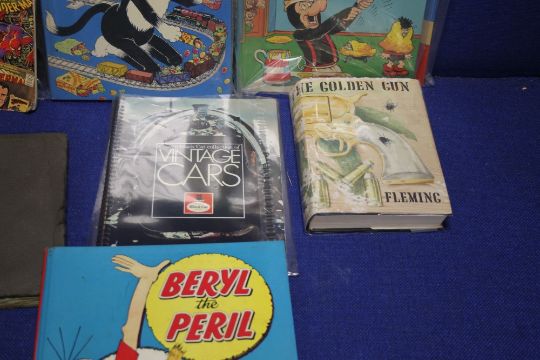 A TRAY CONTAINING AN ALBUM OF OLD TIME FILM STAR PICTURES, DANDY AND BEANO ANNUALS THE 1ST BERYL THE PERIL ANNUAL 1959 ETC (TRAY NOT INCLUDED)
