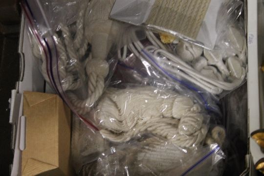 TWO TRAYS OF CURTAIN TIE BACKS, CHAIR COVERINGS ETC (TRAYS NOT INCLUDED)